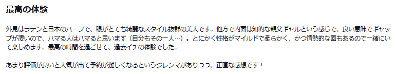 外見はラテンと日本のハーフで、眼がとても綺麗なスタイル抜群の美人です。