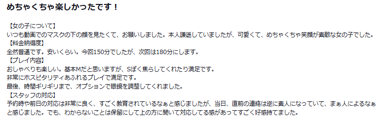 いつも動画でのマスクの下の顔を見たくて、お願いしました。本人謙遜していましたが、可愛くて、めちゃくちゃ笑顔が素敵な女の子でした。