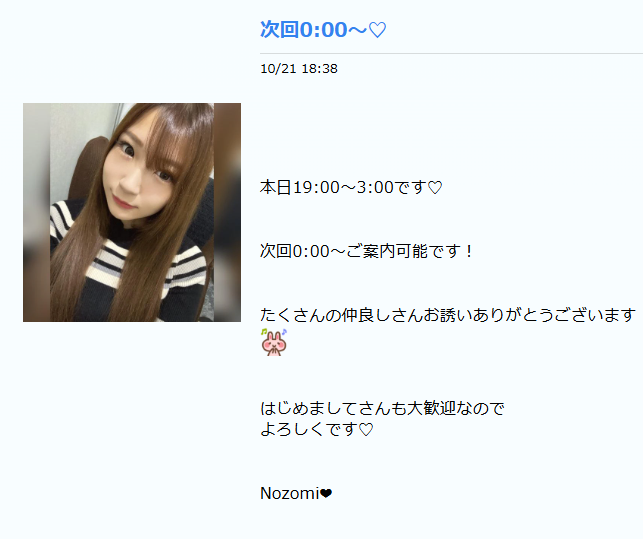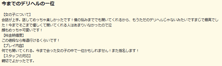 会話が上手。話してめっちゃ楽しかったです!僕の悩みまででも聞いてくれるから、もうただのデリヘルじゃないみたいですまじで最高でした!今までそこまで優しくて聞いてくれる人はあまりいなかったので泣