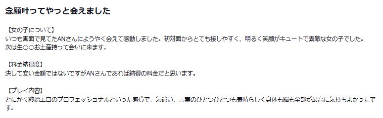 いつも画面で見てたANさんにようやく会えて感動しました。初対面からとても接しやすく、明るく笑顔がキュートで素敵な女の子でした。