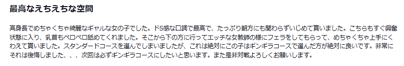 高身長でめちゃくちゃ綺麗なギャルな女の子でした。ドS感な口調で最高で、たっぷり朝方にも関わらずいじめて貰いました。