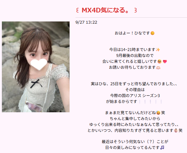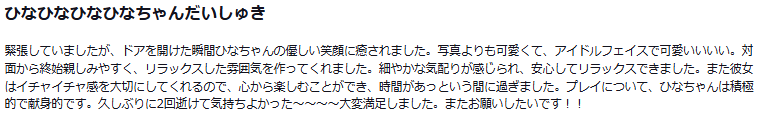 プレイについて、ひなちゃんは積極的で献身的です。久しぶりに2回逝けて気持ちよかった~~~~大変満足しました。またお願いしたいです!!