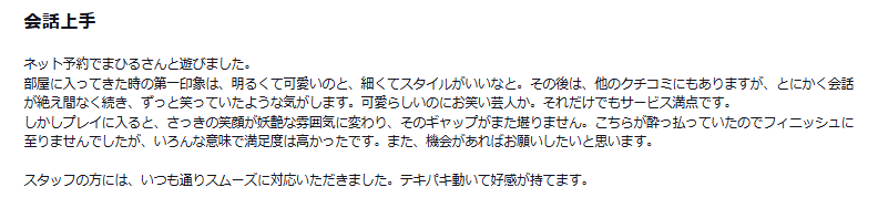 部屋に入ってきた時の第一印象は、明るくて可愛いのと、細くてスタイルがいいなと。その後は、他のクチコミにもありますが、とにかく会話が絶え間なく続き、ずっと笑っていたような気がします。可愛らしいのにお笑い芸人か。それだけでもサービス満点です。