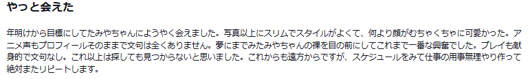 写真以上にスリムでスタイルがよくて、何より顔がむちゃくちゃに可愛かった。アニメ声もプロフィールそのままで文句は全くありません。