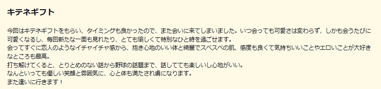 会ってすぐに恋人のようなイチャイチャ感から、抱き心地のいい体と綺麗でスベスベの肌、感度も良くて気持ちいいことやエロいことが大好きなところも最高。