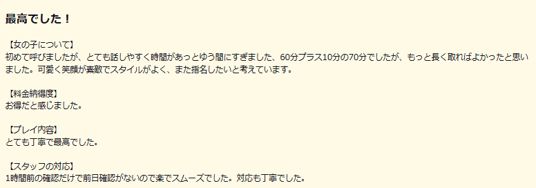 初めて呼びましたが、とても話しやすく時間があっとゆう間にすぎました、60分プラス10分の70分でしたが、もっと長く取ればよかったと思いました。可愛く笑顔が素敵でスタイルがよく、また指名したいと考えています。