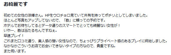 これまた口コミ通り、素人感の強い女性なので、ちょっぴりプライベート感のあるプレイに終始しました。