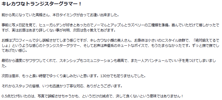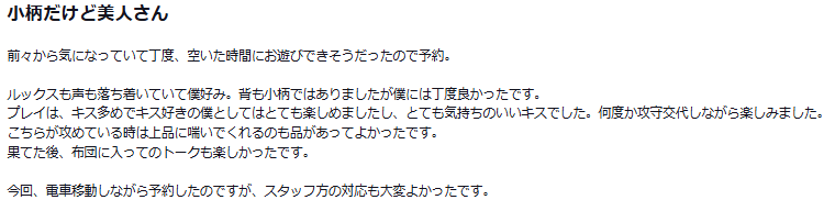 ルックスも声も落ち着いていて僕好み。背も小柄ではありましたが僕には丁度良かったです。