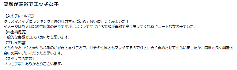 どちらかというと責められるのが好きと言うことで、自分の性癖ともマッチするのでひとしきり責めさせてもらいましたが、感度も良く興奮度合いの高いプレイだったと思います。