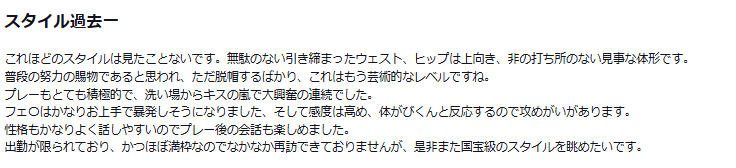 これほどのスタイルは見たことないです。無駄のない引き締まったウェスト、ヒップは上向き、非の打ち所のない見事な体形です。