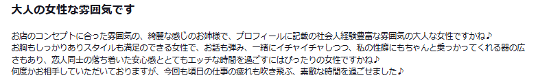 お店のコンセプトに合った雰囲気の、綺麗な感じのお姉様で、プロフィールに記載の社会人経験豊富な雰囲気の大人な女性ですかね♪
