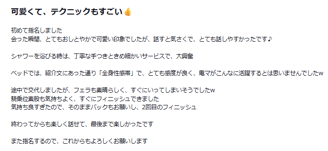 ベッドでは、紹介文にあった通り「全身性感帯」で、とても感度が良く、電マがこんなに活躍するとは思いませんでしたw