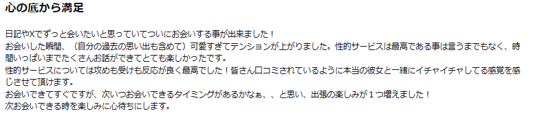 性的サービスについては攻めも受けも反応が良く最高でした!皆さん口コミされているように本当の彼女と一緒にイチャイチャしてる感覚を感じさせて頂けます。