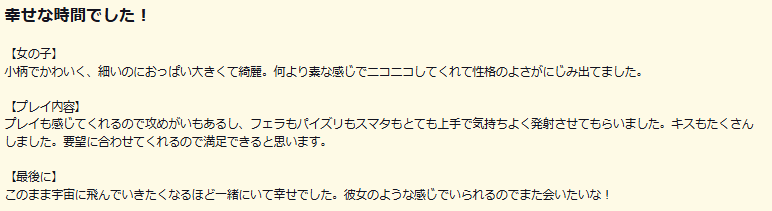 プレイも感じてくれるので攻めがいもあるし、フェラもパイズリもスマタもとても上手で気持ちよく発射させてもらいました。キスもたくさんしました。要望に合わせてくれるので満足できると思います。
