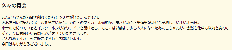 ホテルで待っているとインターホンがなり、ドアを開けたら、そこには以前より少し大人になったあんこちゃんが。会話も仕草も以前と変わらずで、今日も楽しい時間を過ごさせていただきました。