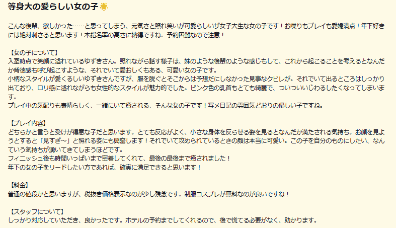 こんな後輩、欲しかった……と思ってしまう、元気さと照れ笑いが可愛らしいザ女子大生な女の子です!お喋りもプレイも愛嬌満点!年下好きには絶対刺さると思います!本指名率の高さに納得ですね。予約困難なので注意!
