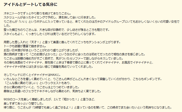 りこさんが「いい」というホテルに入って待っていると、来てくれたのはガチのアイドルグループにいてもおかしくないくらいの可愛い女性でした。