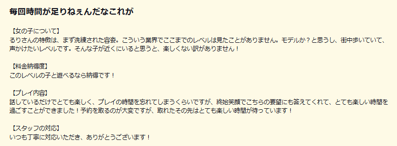 話しているだけでとても楽しく、プレイの時間を忘れてしまうくらいですが、終始笑顔でこちらの要望にも答えてくれて、とても楽しい時間を過ごすことができました!予約を取るのが大変ですが、取れたその先はとても楽しい時間が待っています!