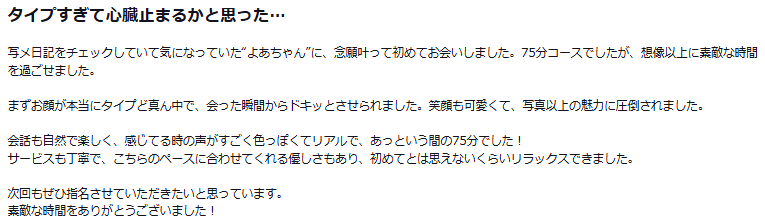 まずお顔が本当にタイプど真ん中で、会った瞬間からドキッとさせられました。笑顔も可愛くて、写真以上の魅力に圧倒されました。